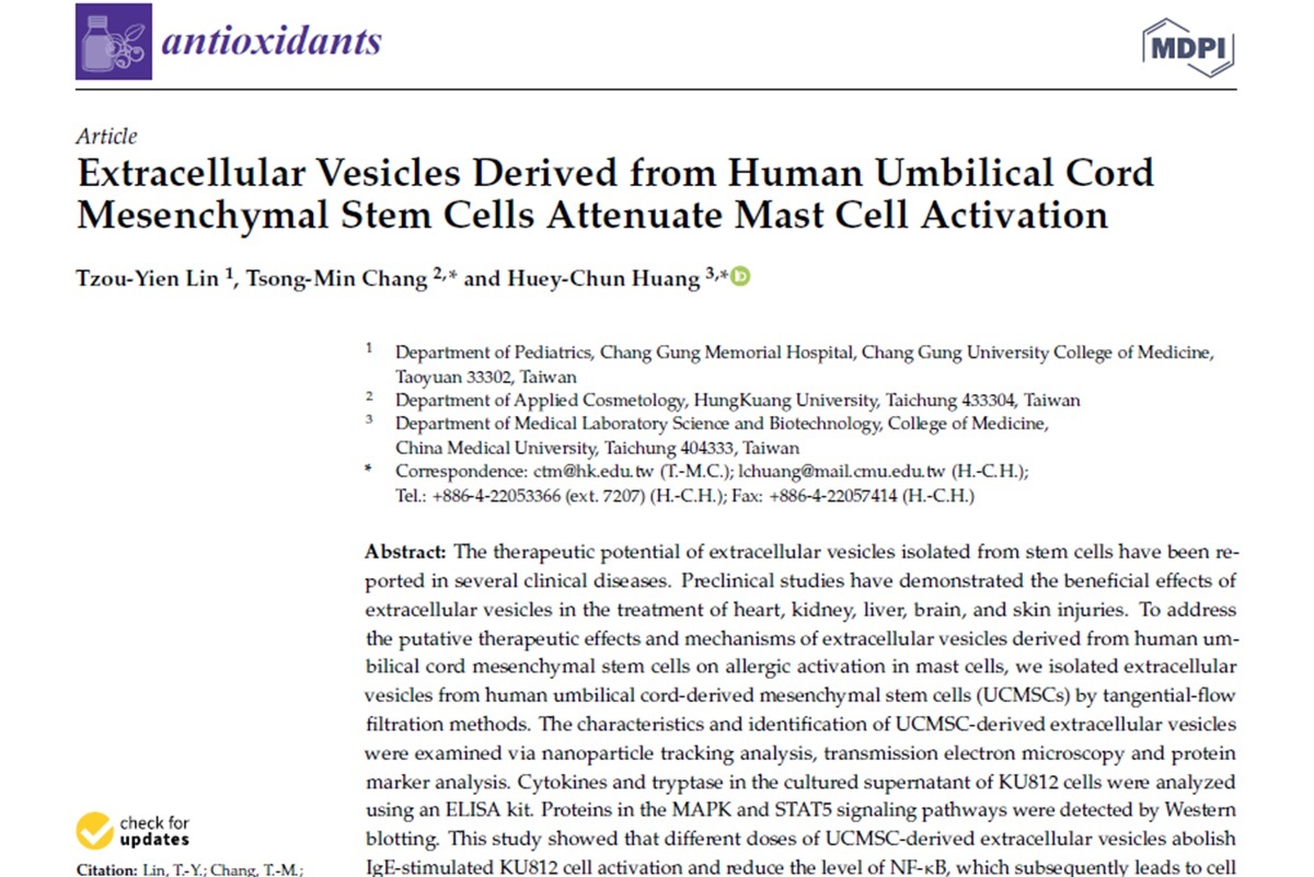 人類臍帶間質幹細胞外泌體可減緩肥大細胞活化,發表於《antioxidants》國際期刊