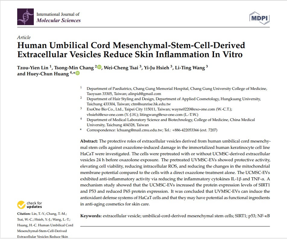 由艾萬霖公司創辦人林奏延醫師擔任第一作者,於2023年12月4日發表在《International Journal of Molecular Sciences》的論文「Human Umbilical Cord Mesenchymal-Stem-Cell-Derived Extracellular Vesicles Reduce Skin Inflammation In Vitro」,從科學實證發現,人類臍帶間質幹細胞來源的外泌體,可降低皮膚發炎反應。 在這篇論文中,實驗室人員先利用化學藥物Oxazolone,刺激人類皮膚角質細胞,造成皮膚發炎。再以發炎的皮膚角質細胞,分成實驗組(有加外泌體)與控制組(沒有加外泌體),結果發現,有加外泌體的實驗組細胞,觀察其IL-1β和TNF-α兩項細胞發炎激素較低,存活率較高,氧化壓力較低。 由此可見,人類臍帶間質幹細胞來源的外泌體,可以誘導皮膚角質細胞的抗氧化防禦系統,可能具有作為皮膚抗衰老化妝品成分的潛力。 論文連結 https://pubmed.ncbi.nlm.nih.gov/38069436/